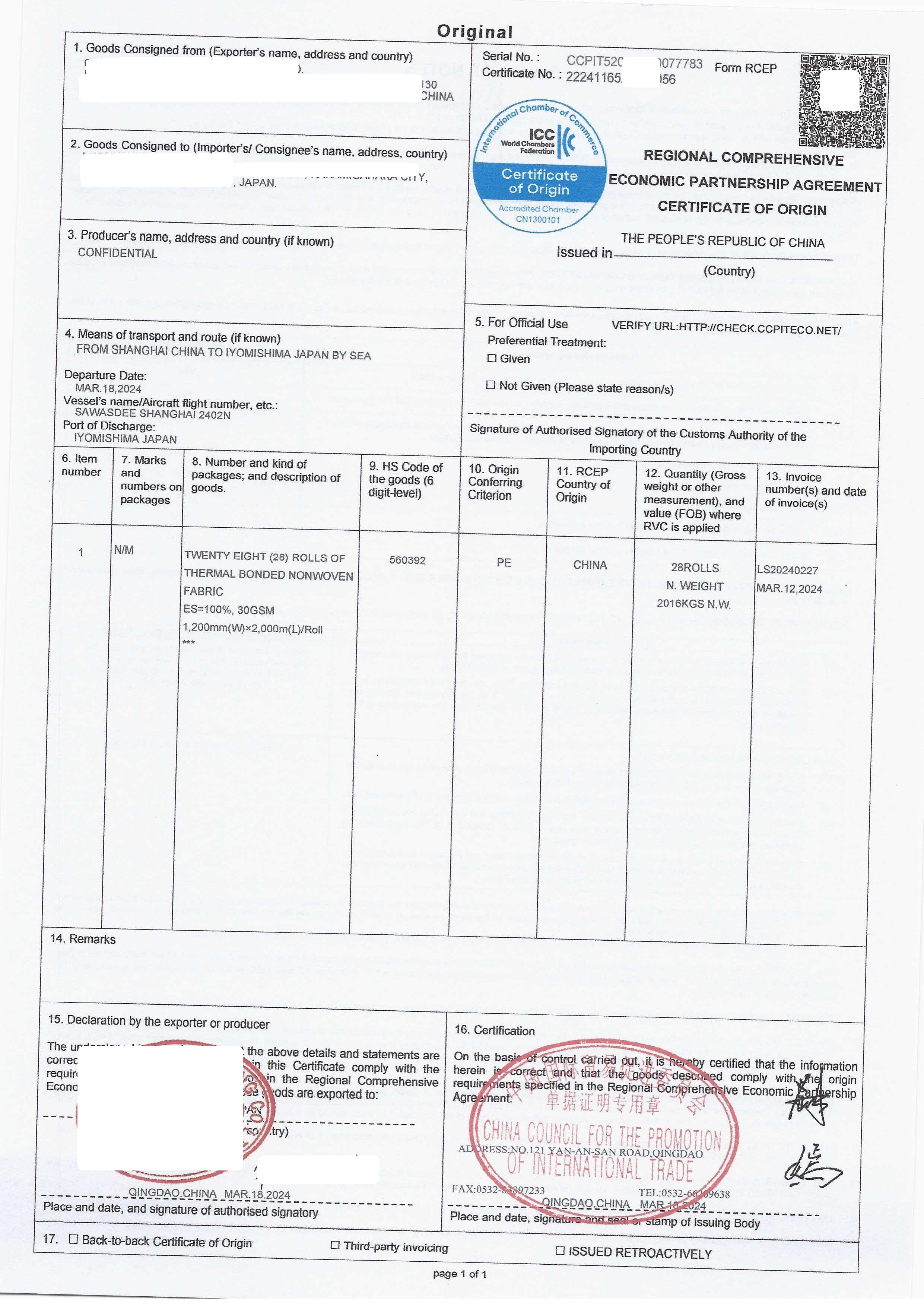 RCEP协定原产地证书是按照RCEP协定的规定签发的一种产地证明。RCEP协定是“区域全面经济伙伴关系协定”的缩写,是亚洲地区一项重要的贸易协定。这份证书的目的是证明产品的原产地,以便享受RCEP协定提供的关税减免。