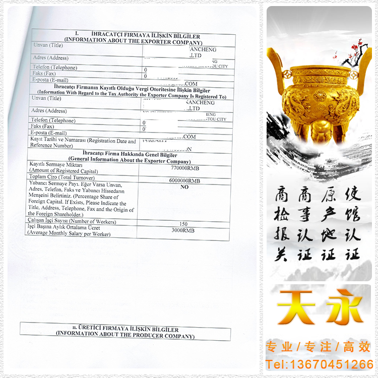 办理土耳其出口商登记表需要区分地区,如果是大陆公司,则送上海土耳其领事馆认证,如果是香港公司,则送土耳其驻香港领事馆进行认证;
