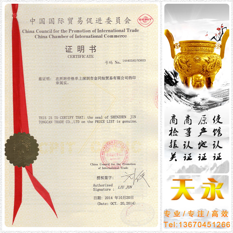 中国国际贸促促进委员会商事认证,也称中国商会认证,CCPIT认证,贸促会认证