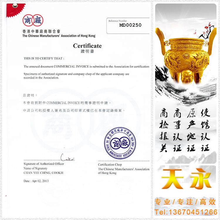 以下是香港厂商会认证各类文件的样本,仅供参考