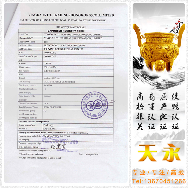 天永实业(深圳)有限公司是经由海关总署,出入境检验检疫局,中国国际促进贸易委员香港总商会,厂商会,香港中检公司会批准,拥有独立进出口权经营权,无论是空运、海运、陆运我们都能以具有竞争力的价格来为您简化货物进出口的流程以及手续,帮您代办全球各国的清关文件,如产地证书,各类文件贸促会CCPIT认证,香港商会认证,自由销售证书,大使馆认证,自由销售证明,未再加工证明,土耳其出口商登记表,以及各检测机构的认证,多年以来,我们持续与AQSIQ(质量监督检验检疫局)、CCIC(商检局)以及CCPIT(贸促会)紧密协作,并且得到了中国海关的支持,得益于此,天永实业能够以最专业的行业知识,最具竞争力的价格,深广的行业资源,来确保对您的每一次服务的保驾护航。